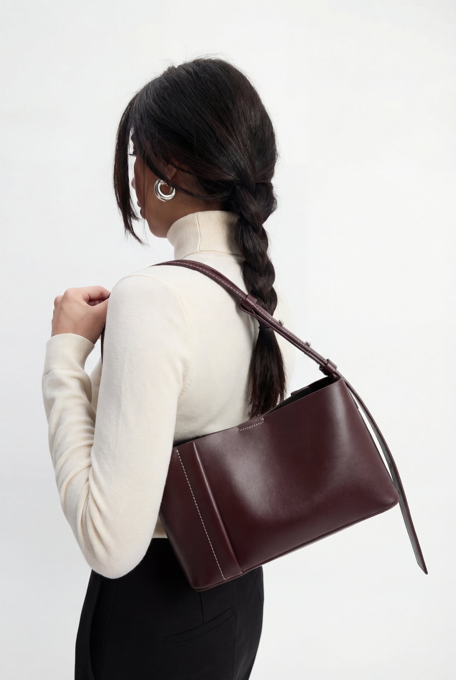 The Small Tote Plissé is defined by its architectural east–west silhouette, built through a cross-symmetric pleated construction that gives the design its distinctive structure. The design is crafted from LWG-certified premium Italian calfskin and finished with bold off-white contrast stitching that deliberately accentuates its form.