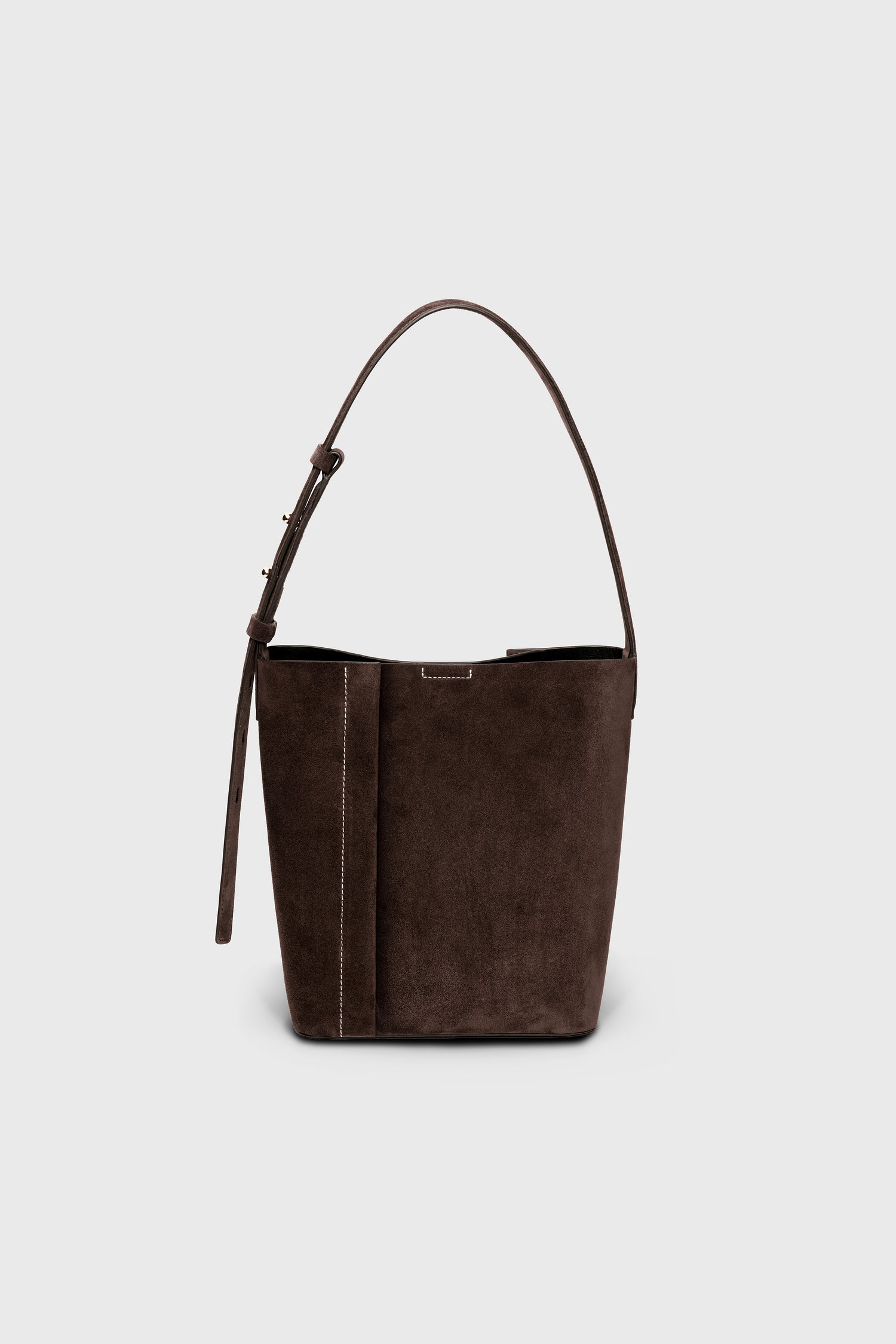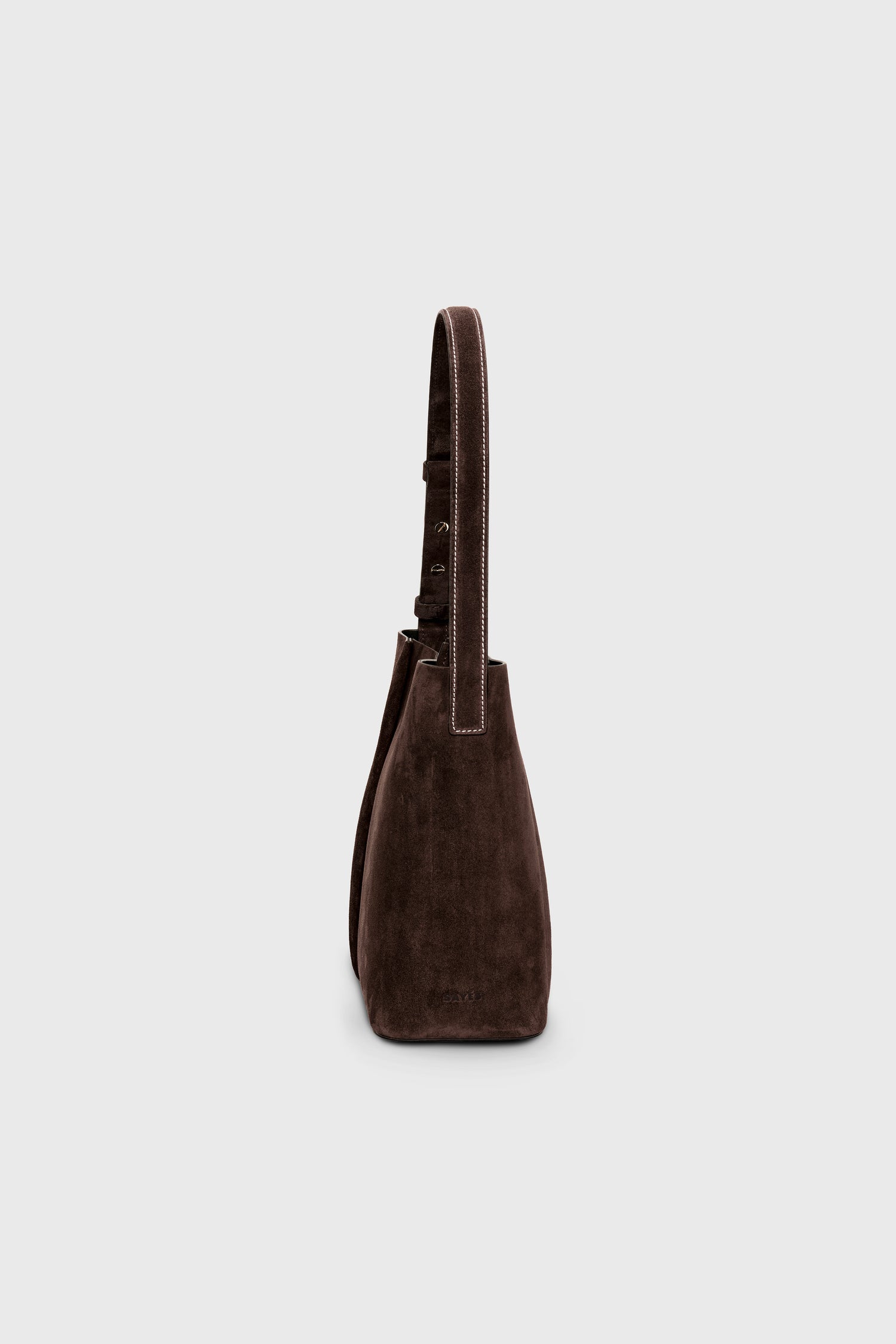 The Medium Tote Plissé features a cross symmetric pleated construction giving the design its structural form, crafted from LWG-certified premium brown suede with contrast off-white stitching. Detailed with an embossed SAYÉS logo on the right side; completed with an adjustable shoulder strap and a discrete magnetic button closure.